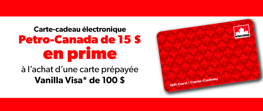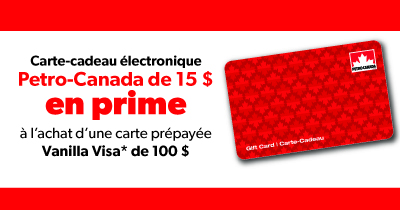 Offre valide dans les dépanneurs seulement des établissements Petro-Canada participants du 10 février au 16 mars 2026. Pour être admissible à cette promotion, le client doit acheter une carte prépayée VanillaMD Visa* d’une valeur de 100 $. Cette offre exclut la carte prépayée Vanilla MastercardMD. Avec chaque carte prépayée achetée, le client peut recevoir une (1) carte-cadeau électronique Petro-Canada de 15 $ en prime. Pour réclamer le(s) carte(s)-cadeau(x) électronique(s) Petro-Canada de 15 $, allez à cardreward.ca. Vous devez réclamer votre carte-cadeau électronique Petro-Canada de 15 $ en prime au plus tard le 18 mars 2026. Disponible jusqu'à épuisement des stocks de cartes-cadeaux électroniques seulement. Voir le site Web et/ou les cartes-cadeaux pour plus de détails et les conditions. Toutes les marques déposées sont la propriété de leurs propriétaires respectifs. La carte prépayée Vanilla Visa* est émise par la Compagnie de Fiducie Peoples, en vertu d’une licence de Visa Int. *Marque de commerce de Visa International Service Association et utilisée sous licence par la Compagnie de Fiducie Peoples. Les cartes-cadeaux seront uniquement vendues entre 6 h et 23 h. Une pièce d’identité émise par le gouvernement pourrait être requise. Aucun remboursement ou échange sur les cartes-cadeaux achetées. Les cartes prépayées Petro-Canada, Vanilla MastercardMD ou Vanilla Visa* ne peuvent être utilisées pour acheter d’autres cartes-cadeaux. Les Petro-Points seront émis en fonction des achats lorsque la carte-cadeau Petro-Canada est utilisée comme mode de paiement; aucun point ne sera accordé au moment de l’achat de la carte-cadeau Petro-Canada.