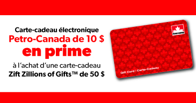 Offre valide dans les dépanneurs seulement des établissements Petro-Canada participants du 18 novembre au 5 janvier 2026. Pour être admissible à cette promotion, le client doit acheter une carte-cadeau Zift Zillions of Gifts™ d’une valeur de 50 $. Avec chaque carte prépayée achetée, le client peut recevoir une (1) carte-cadeau électronique Petro-Canada de 10 $ en prime. Pour réclamer le(s) carte(s)-cadeau(x) électronique(s) Petro-Canada de 10 $, allez à cardreward.ca. Vous devez réclamer votre carte-cadeau électronique Petro-Canada de 10$ en prime au plus tard le 7 janvier 2026. Disponible jusqu'à épuisement des stocks de cartes-cadeaux électroniques seulement. Voir le site Web et/ou les cartes-cadeaux pour plus de détails et les conditions. Toutes les marques déposées sont la propriété de leurs propriétaires respectifs. La sélection de cartes-cadeaux Zift Zillions of Gifts™ varie selon le magasin. Offre valable au moment de l'achat. Les cartes Zift Zillions of Gifts™ sont émises par la Compagnie de Fiducie Peoples. La carte est échangeable uniquement sur le site ZillionsGift.ca contre des cartes-cadeaux électroniques des marques participantes, au Canada. Les options et les montants de la marque peuvent varier et être modifiés. Les marques de commerce des marchands sont la propriété intellectuelle des marchands respectifs et sont utilisées avec autorisation. Pas d'accès aux espèces ni aux distributeurs automatiques. Des conditions générales s'appliquent. Voir le contrat électronique du titulaire de la carte pour plus de détails. Les émetteurs n'approuvent pas, ne sponsorisent pas et ne sont en aucun cas affiliés à cette offre. Les cartes-cadeaux seront uniquement vendues entre 6 h et 23 h. Une pièce d’identité émise par le gouvernement pourrait être requise. Aucun remboursement ou échange sur les cartes-cadeaux achetées. Les cartes prépayées Petro-Canada, Vanilla MastercardMD ou Vanilla Visa* ne peuvent être utilisées pour acheter d’autres cartes-cadeaux. Les Petro-Points seront émis en fonction des achats lorsque la carte-cadeau Petro-Canada est utilisée comme mode de paiement; aucun point ne sera accordé au moment de l’achat de la carte-cadeau Petro-Canada.